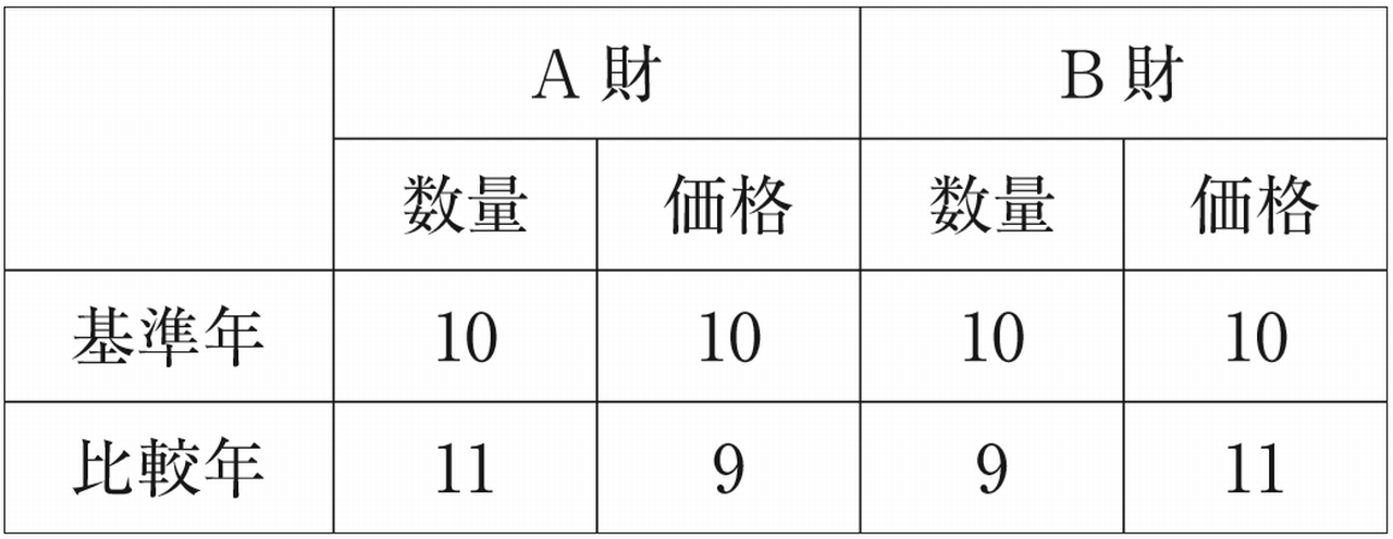 種類の財(A 財と B 財)を用いて、物価指数を計算する。これらの財の数量と単位当たりの価格は、基準年と比較年でそれぞれ以下の表のとおりであった。基準年の物価指数を 100 とした場合、比較年の物価指数として最も適切なものを下記の解答群から選べ。